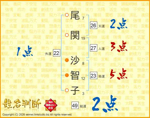 尾(7画)関(19画) 沙(8画)智(12画)子(3画)