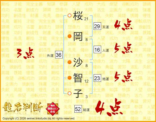 桜(21画)岡(8画) 沙(8画)智(12画)子(3画)
