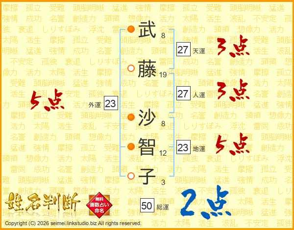 武(8画)藤(19画) 沙(8画)智(12画)子(3画)