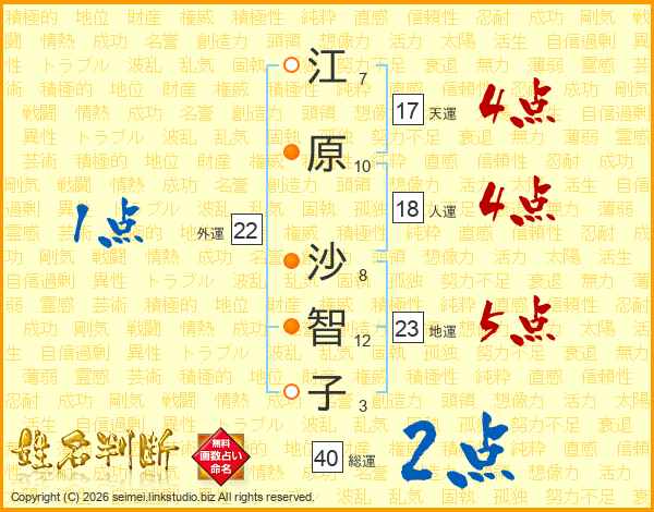 江(7画)原(10画) 沙(8画)智(12画)子(3画)