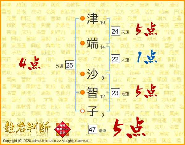 津(10画)端(14画) 沙(8画)智(12画)子(3画)
