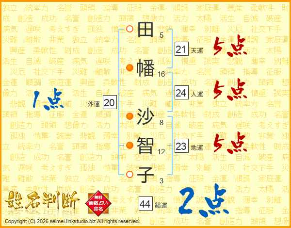 田(5画)幡(16画) 沙(8画)智(12画)子(3画)