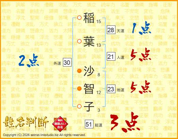 稲(15画)葉(13画) 沙(8画)智(12画)子(3画)