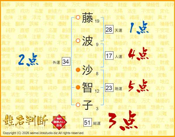 藤(19画)波(9画) 沙(8画)智(12画)子(3画)