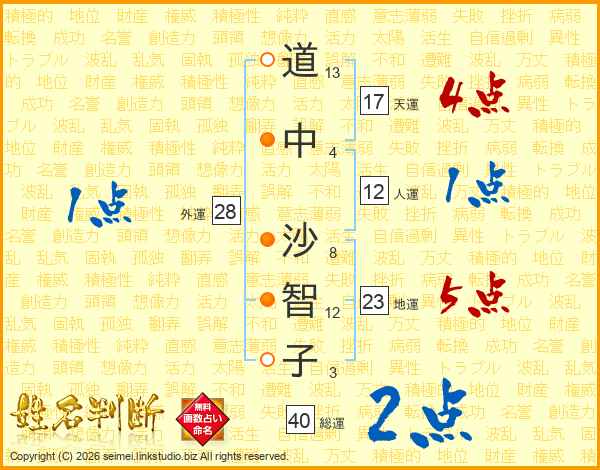 道(13画)中(4画) 沙(8画)智(12画)子(3画)