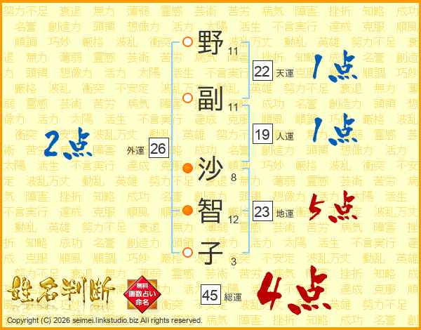 野(11画)副(11画) 沙(8画)智(12画)子(3画)