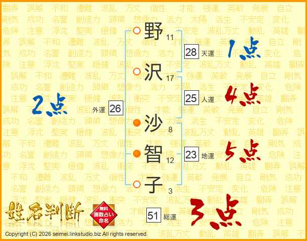 野(11画)沢(17画) 沙(8画)智(12画)子(3画)