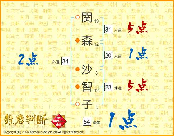 関(19画)森(12画) 沙(8画)智(12画)子(3画)