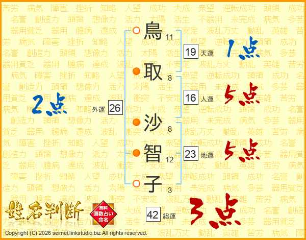 鳥(11画)取(8画) 沙(8画)智(12画)子(3画)