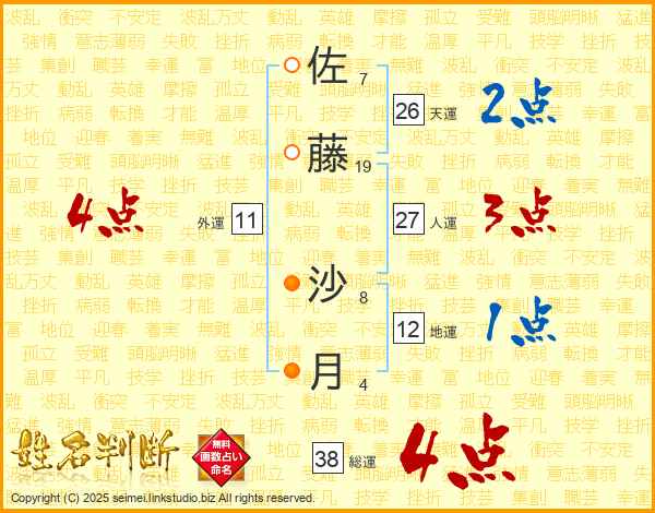 佐(7画)藤(19画) 沙(8画)月(4画)