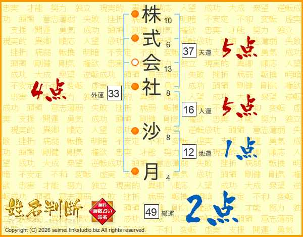 株(10画)式(6画)会(13画)社(8画) 沙(8画)月(4画)