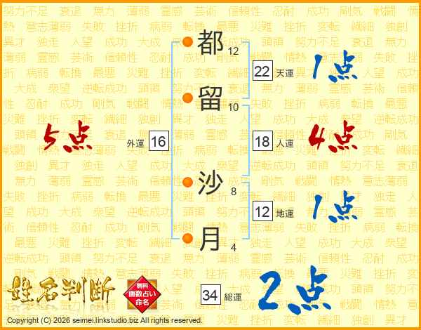 都留沙月さんの総運は34画の2点!