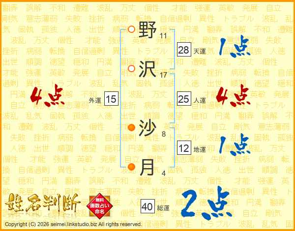 野(11画)沢(17画) 沙(8画)月(4画)