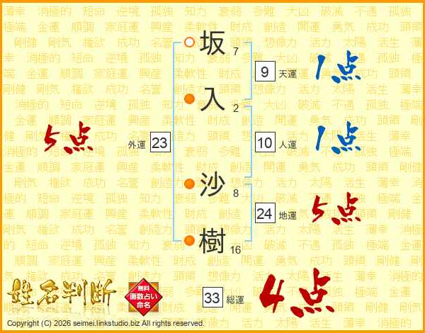 坂(7画)入(2画) 沙(8画)樹(16画)
