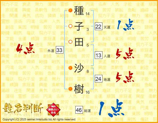 種(14画)子(3画)田(5画) 沙(8画)樹(16画)