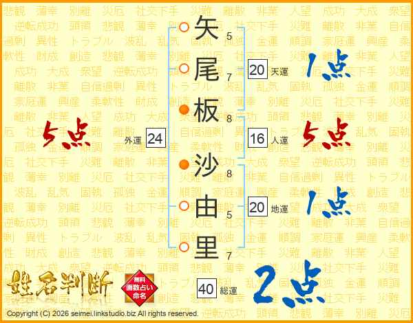 生活面を象徴する運勢です。外部から受ける影響力を表し、結婚運、家庭運や職場、環境への順応性を表します。総運から人運を引いた画数。姓や名が1文字の場合を除く。