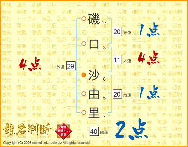 磯(17画)口(3画) 沙(8画)由(5画)里(7画)