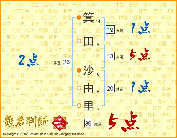 箕(14画)田(5画) 沙(8画)由(5画)里(7画)