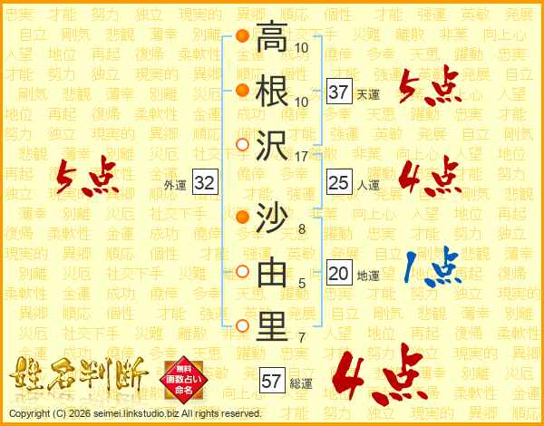 高根沢沙由里さんの外運は32画の5点!