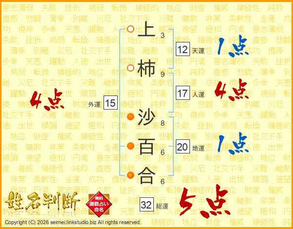 生活面を象徴する運勢です。外部から受ける影響力を表し、結婚運、家庭運や職場、環境への順応性を表します。総運から人運を引いた画数。姓や名が1文字の場合を除く。