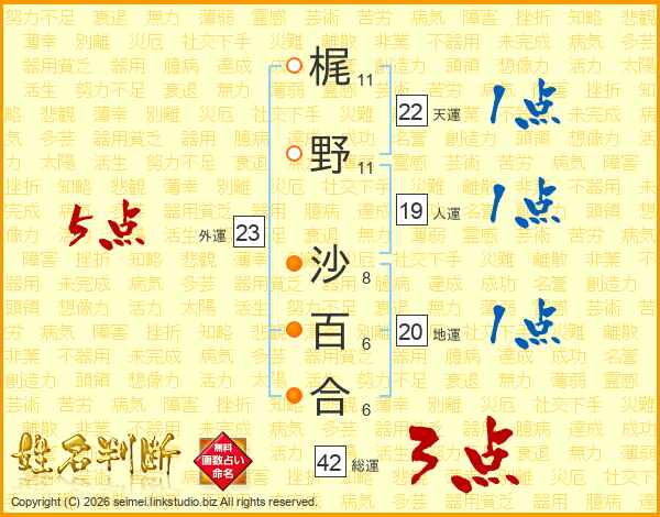 梶(11画)野(11画) 沙(8画)百(6画)合(6画)