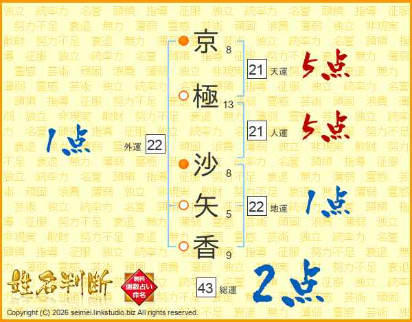 京(8画)極(13画) 沙(8画)矢(5画)香(9画)