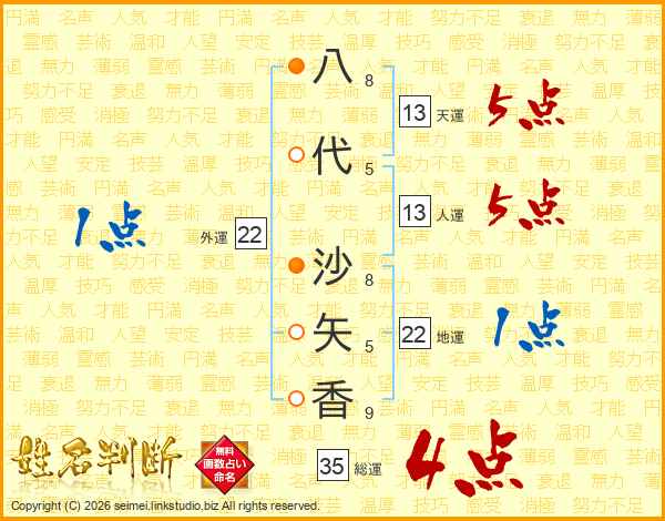 八(8画)代(5画) 沙(8画)矢(5画)香(9画)