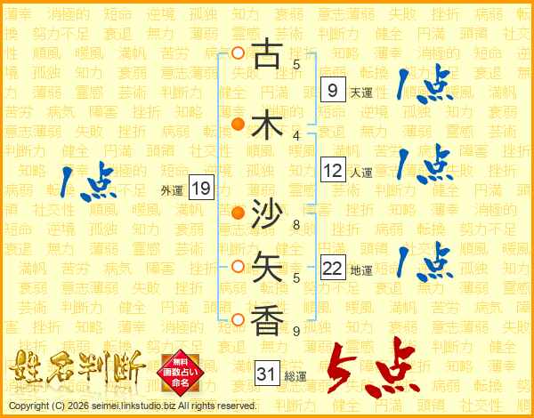 古(5画)木(4画) 沙(8画)矢(5画)香(9画)