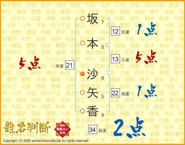 坂(7画)本(5画) 沙(8画)矢(5画)香(9画)