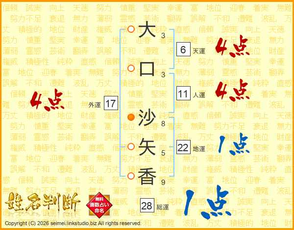 大(3画)口(3画) 沙(8画)矢(5画)香(9画)