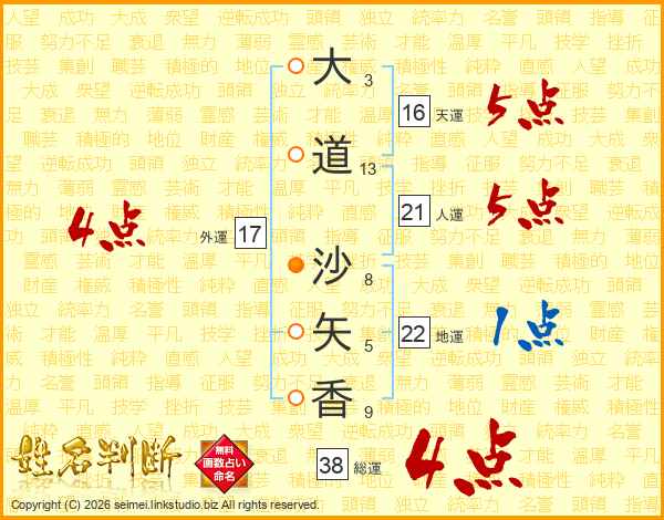 大(3画)道(13画) 沙(8画)矢(5画)香(9画)