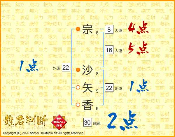 宗沙矢香さんの総運は30画の2点!