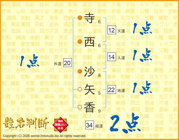 寺西沙矢香さんの総運は34画の2点!