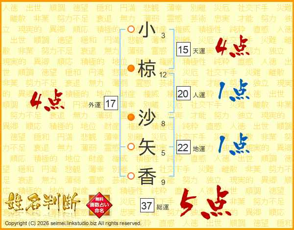 小(3画)椋(12画) 沙(8画)矢(5画)香(9画)