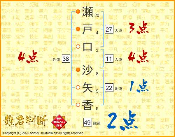 瀬戸口沙矢香さんの総運は49画の2点!