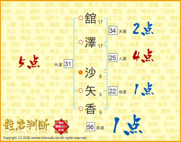 舘(17画)澤(17画) 沙(8画)矢(5画)香(9画)