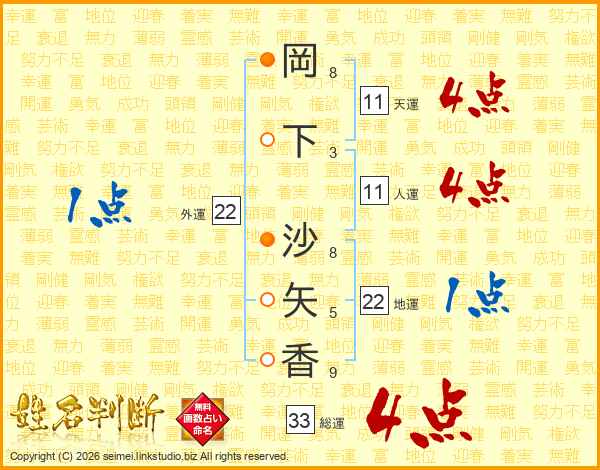 岡(8画)下(3画) 沙(8画)矢(5画)香(9画)