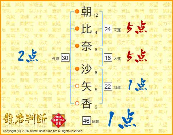 朝(12画)比(4画)奈(8画) 沙(8画)矢(5画)香(9画)