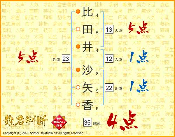 比(4画)田(5画)井(4画) 沙(8画)矢(5画)香(9画)