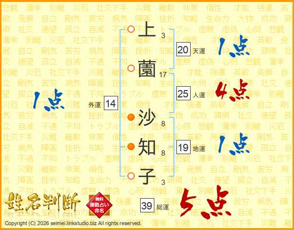 上(3画)薗(17画) 沙(8画)知(8画)子(3画)