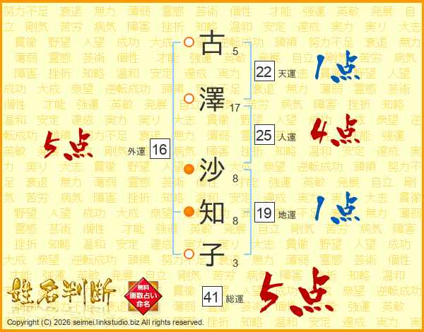 古(5画)澤(17画) 沙(8画)知(8画)子(3画)