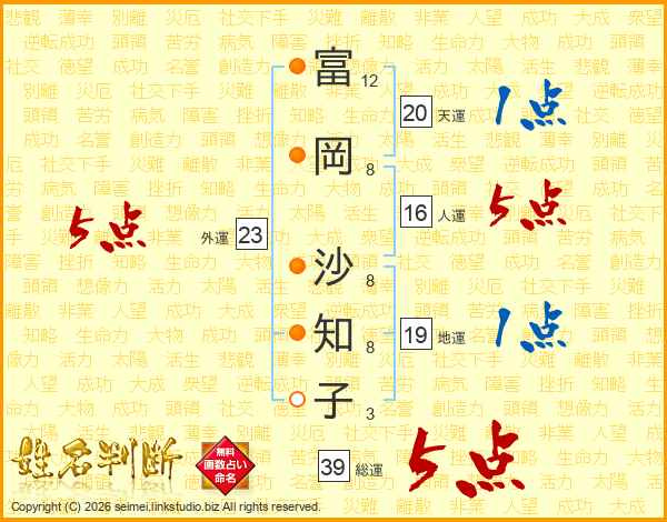 富岡沙知子さんの総運は39画の5点!