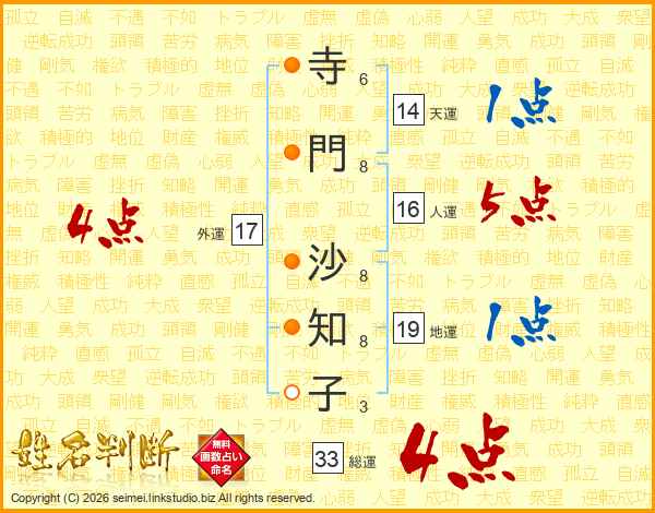 寺(6画)門(8画) 沙(8画)知(8画)子(3画)
