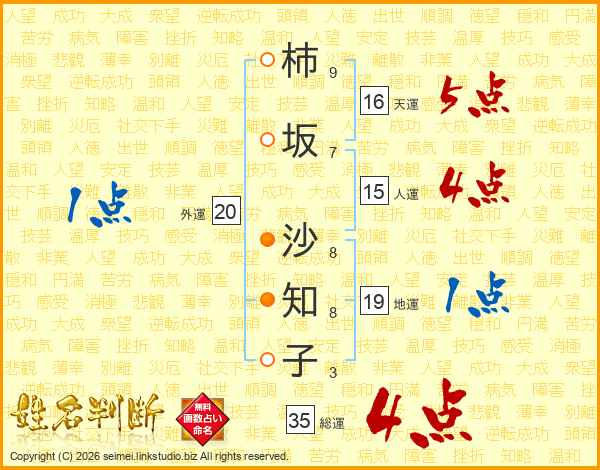 柿(9画)坂(7画) 沙(8画)知(8画)子(3画)