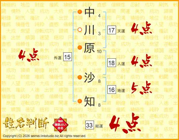 中(4画)川(3画)原(10画) 沙(8画)知(8画)