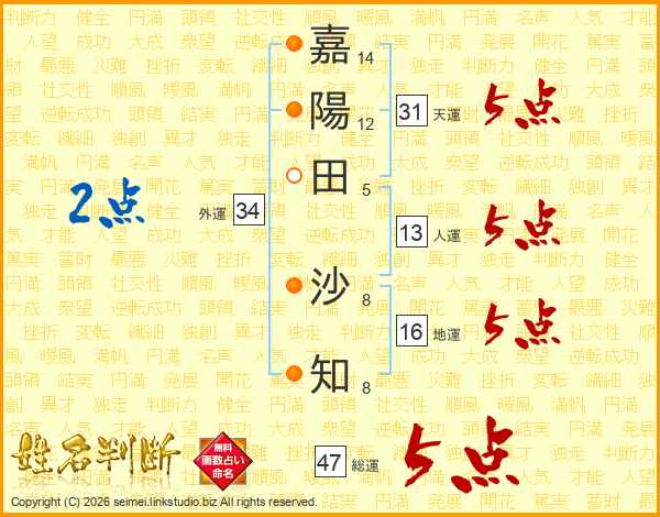 嘉(14画)陽(12画)田(5画) 沙(8画)知(8画)