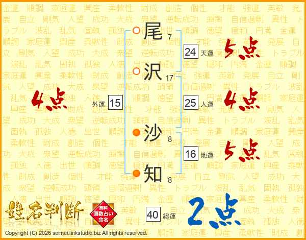 尾(7画)沢(17画) 沙(8画)知(8画)