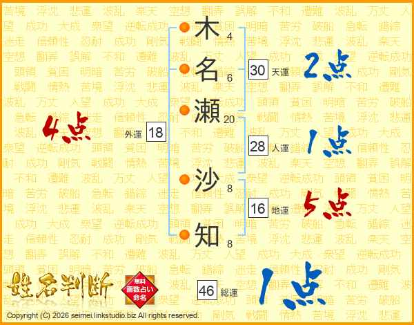 木(4画)名(6画)瀬(20画) 沙(8画)知(8画)