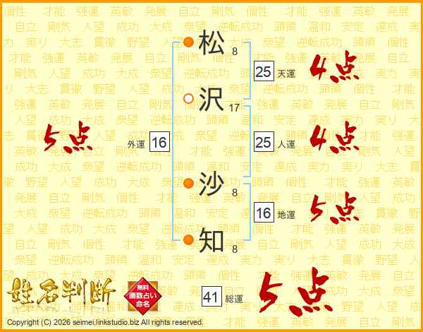生活面を象徴する運勢です。外部から受ける影響力を表し、結婚運、家庭運や職場、環境への順応性を表します。総運から人運を引いた画数。姓や名が1文字の場合を除く。
