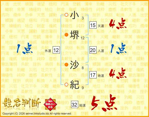 小(3画)堺(12画) 沙(8画)紀(9画)